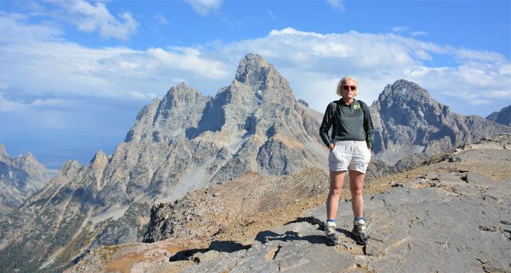 Yelena on the top of Table Mountain, Rocky Mountains. Grand Teton, Middle Teton and South